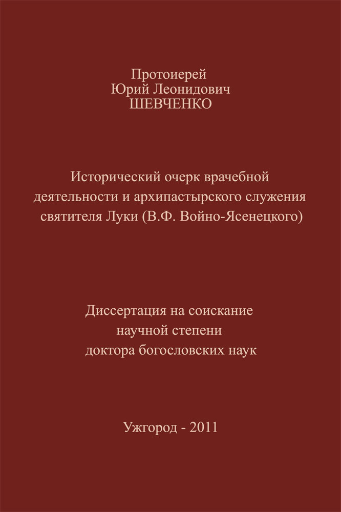 Исторический очерк врачебной деятельности и архипастырского служения святителя Луки (В.Ф. Войно-Ясенецкого). Диссертация на соискание учёной степени доктора богословских наук. — Ужгород, 2011.