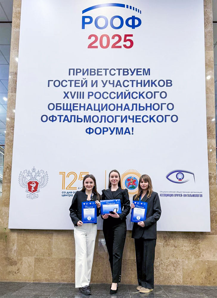 На специальной секции для молодых учёных, представляющих собственные исследования, выступили аспиранты Кафедры глазных болезней ИУВ Пироговского Центра: Мария Артуровна Альварес представила доклад «Особенности эпидемиологии у молодых пациентов с далекозашедшей пролиферативной диабетической ретинопатией», Анастасия Ильинична Егорова продолжила тему хирургии макулярных разрывов в своём докладе «Хирургическое лечение гигантских макулярных разрывов методом аутотрансплантации сетчатки». Ординатор Кафедры глазных болезней ИУВ Пироговского Центра Вера Николаевна Бородкина представила интересные данные в своей работе «Оптическая когерентная томография в оценке морфометрических показателей сетчатки у пациентов с ригидным макулярным разрывом».