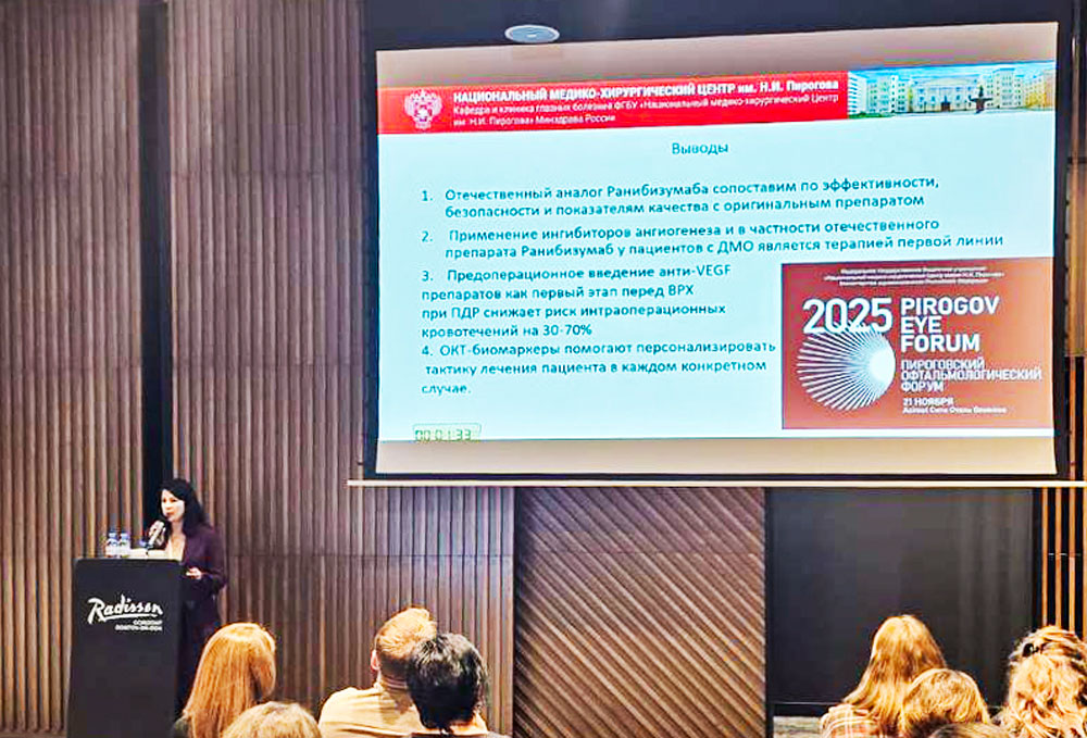 В работе конференции принимала участие врач-офтальмолог Центра офтальмологии ФГБУ «НМХЦ им. Н.И. Пирогова» Минздрава России Валерия Сергеевна Клев с докладом «Опыт применения первого отечественного анти-VEGF препарата Ранибизумаб в реальной клинической практике у пациентов с диабетической ретинопатией». Практические наработки и клинические кейсы пациентов, пролеченных в Центре офтальмологии ФГБУ «НМХЦ им. Н.И. Пирогова» Минздрава России, вызвали большой интерес и живую дискуссию.