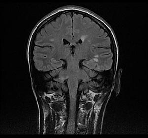 В отделение неврологии поступила 33-летняя пациента с жалобами на шаткость при ходьбе, онемение нижних конечностей, нарушение функции тазовых органов При сборе анамнеза установлено, что с октября 2009 г после перенесенной около месяца назад респираторной вирусной инфекции, сопровождавшееся катаральными проявлениями, лихорадкой, стала отмечать онемение в нижних конечностях, которое частично регрессировало в течение последующих нескольких недель без лечения. С декабря 2009 г стала отмечать появление нарушения контроля функции тазовых органов, онемение в области живота. Данные нарушения постепенно прогрессировали, что заставило обратиться в медицинское учреждение. При обследовании проведено МРТ головного мозга, не выявившее патологии. Специфическое лечение не назначалось. В начале января 2010 г к вышеуказанным проявлениям внезапно присоединилась выраженная шаткость и неустойчивость при ходьбе, скованность в ногах. Резко снизилась трудоспособность, больная был ограничена в передвижении по квартире, в связи с чем с направительным диагнозом нарушение мозгового кровообращения госпитализирована. При поступлении в отделение в неврологическом статусе: выявлялся мелкоамплитудный нистагм в горизонтальной и вертикальной плоскости с ротаторным компонентом. Имело место оживление сухожильных рефлексов с наличием патологических стопных рефлексов (симптом Бабинского с двух сторон). Брюшные рефлексы отсутствовали. Отмечена выраженная неустойчивость при ходьбе, значительные нарушения при выполнении координаторных проб, с наличием интенционного тремора. Чувствительные нарушения представлены гипестезией по проводниковому типу с уровня Th10, а также имело место нарушение функций тазовых органов по центральному типу Учитывая возраст пациентки, отсутствие факторов риска развития сосудистых осложнений, данные анамнеза о факте перенесенного вирусного заболевания накануне развития клинических проявлений, было высказано предположение, которое не позволяло заподозрить демиелинизирующее заболевание центральной нервной системы. Для подтверждения диагноза проведено МРТ головного мозга: