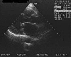 ![]() | Рис. 2. А Эхокардиографическое исследование больного с митральным стенозом в В-режиме по продольной оси. Митральное отверстие сужено, с отложениями кальцинатов по свободному краю. |