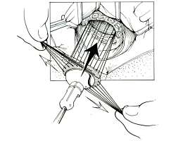 ![]() Рис. 4, а. Доступ к митральному клапану через правую стенку левого предсердия. | ![]() Рис. 4, б. Этапы выполнения открытой митральной комиссуротомии: рассечение створок клапана по комиссурам. |